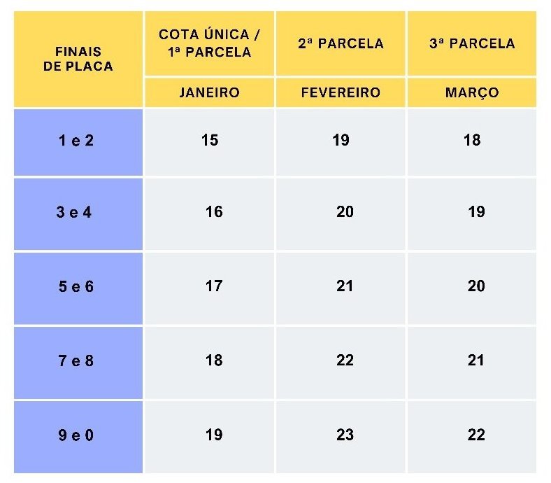 A escala de pagamentos da primeira parcela ou cota única começa em 15/1/2024 para veículos com finais de placas 1 e 2, e termina em 22/3/2024 para a quitação da terceira parcela dos veículos com finais de placas 9 e 0. Confira abaixo: